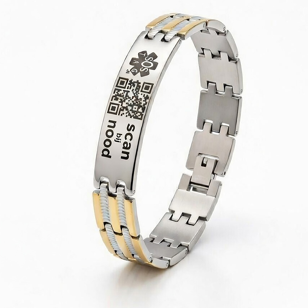 Armband van RVS met en een accent van goud kleur. Speciaal gemaakt om als SOS armband, ID armband of ICE armband altijd te kunnen dragen.